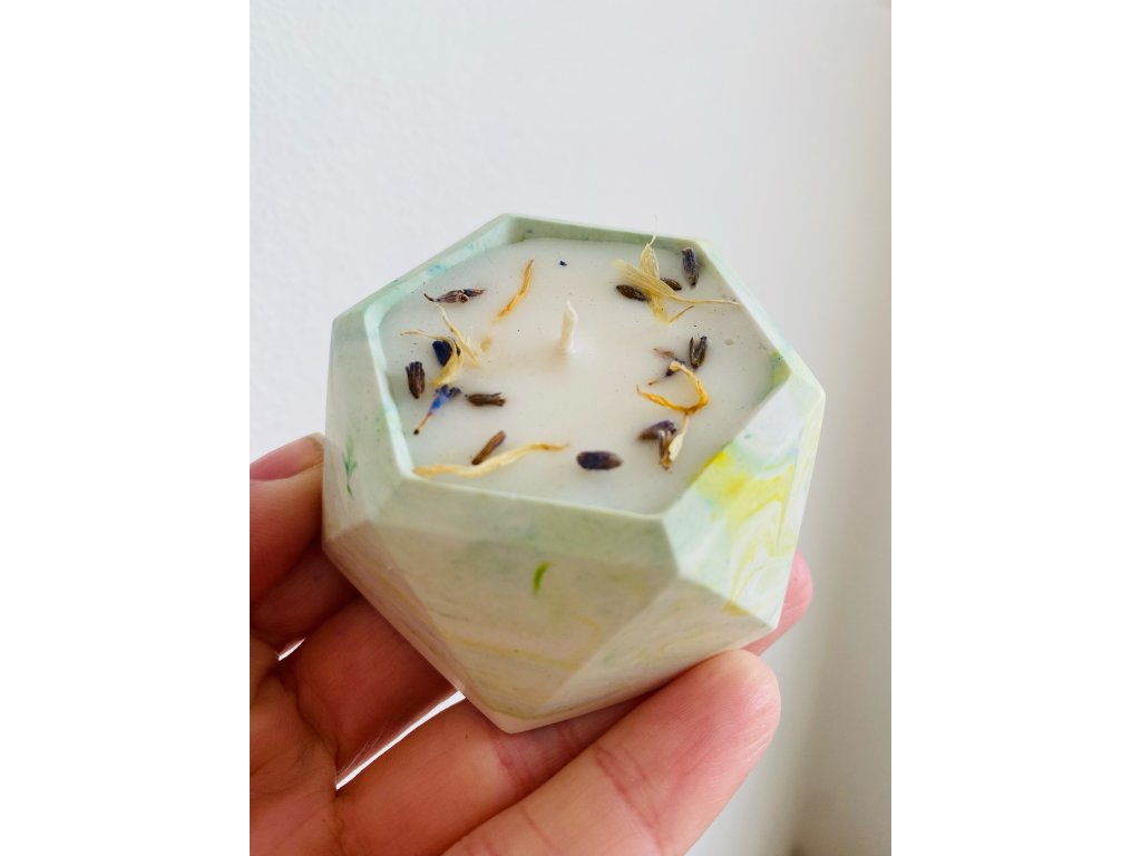 Nádoba je ručně vyrobena z lehkého betonu,která se dá po vypálení svíčky dále požívat. Tento materiál je velmi odolný a nehořlavý. Díky ruční výrobě se mohou v materiálu objevit malé nedokonalosti, jako jsou například vzduchové bublinky, které nemají na celkovou kvalitu vliv a jsou běžným jevem.