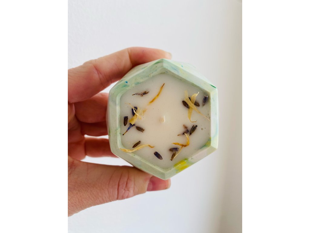 Veganská sójová svíčka s vůní levandule, meduňky a citronové trávy, obsahující sušenou bio levanduli ze zahrádky a měsíček.