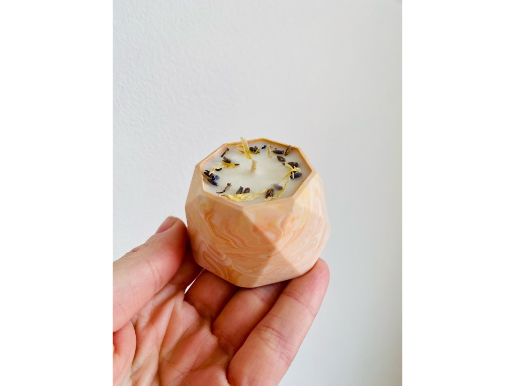 Nádoba je ručně vyrobena z lehkého betonu,která se dá po vypálení svíčky dále požívat. Tento materiál je velmi odolný a nehořlavý. Díky ruční výrobě se mohou v materiálu objevit malé nedokonalosti, jako jsou například vzduchové bublinky, které nemají na celkovou kvalitu vliv a jsou běžným jevem.