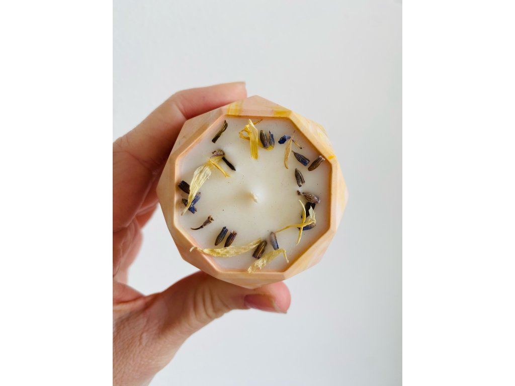 Veganská sójová svíčka s vůní levandule, meduňky a citronové trávy, obsahující sušenou bio levanduli ze zahrádky a měsíček.