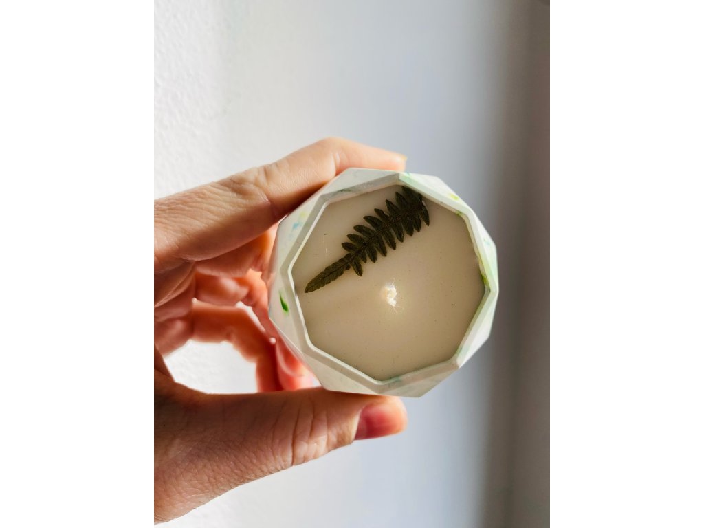 Veganská sójová svíčka s vůní cedru, pačuli, ambry a kadidla, obsahující vylisovanou kapradinu.