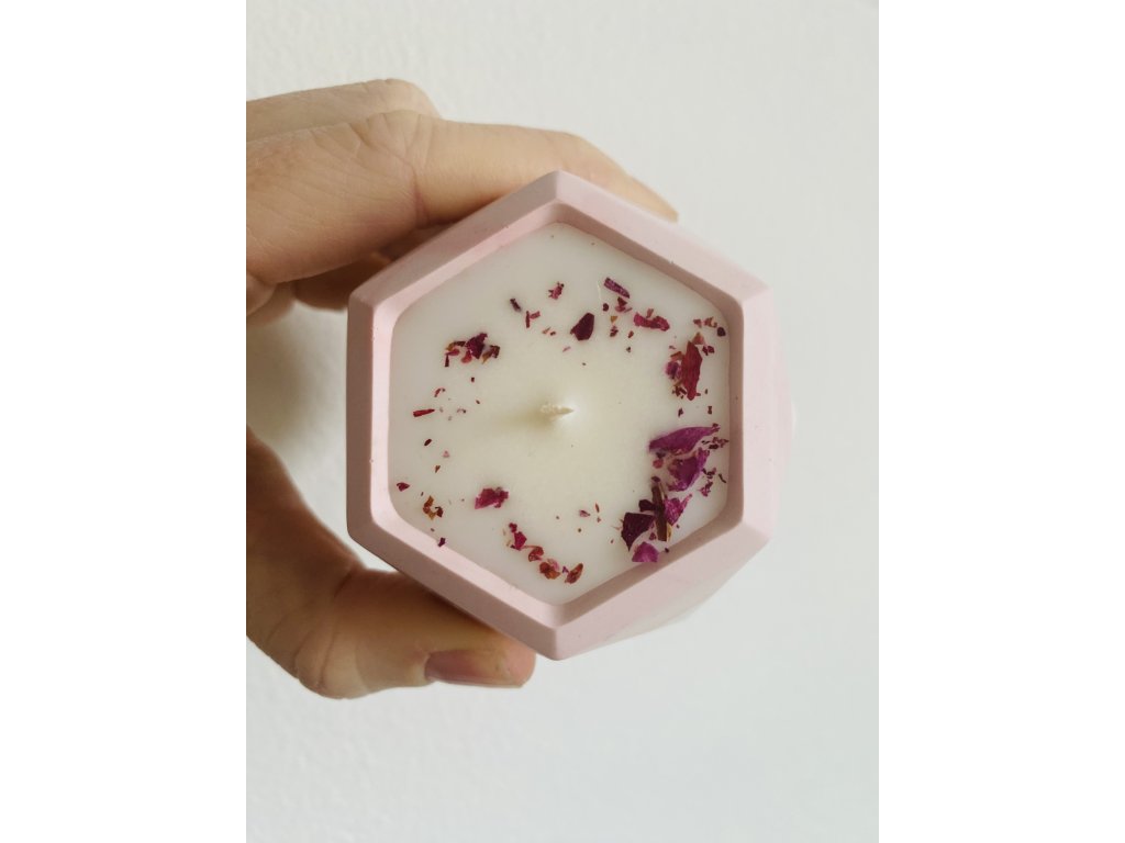 Veganská sójová svíčka s květinovými tóny obsahující sušené okvětní lístky růže ze zahrádky.