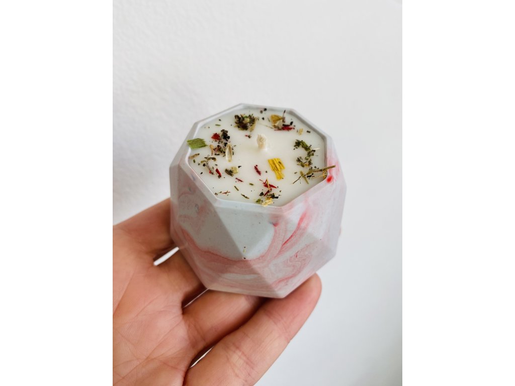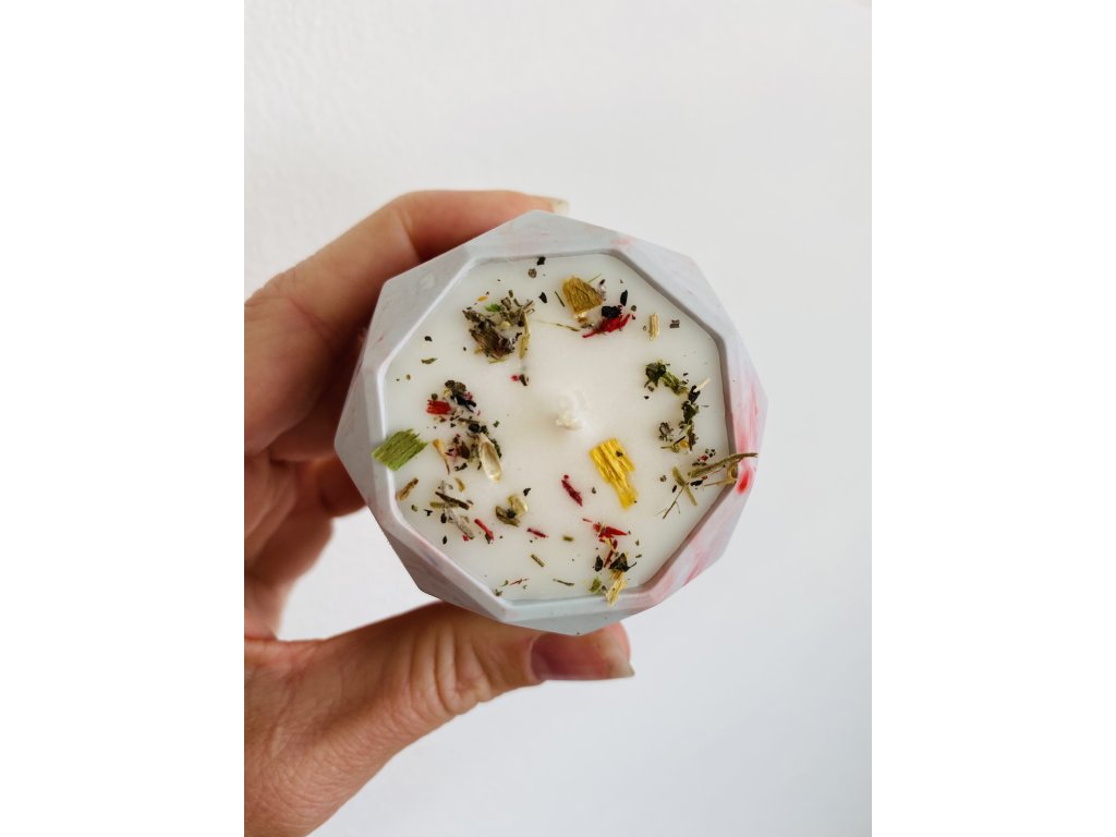 Nádoba je ručně vyrobena z lehkého betonu,která se dá po vypálení svíčky dále požívat. Tento materiál je velmi odolný a nehořlavý. Díky ruční výrobě se mohou v materiálu objevit malé nedokonalosti, jako jsou například vzduchové bublinky, které nemají na celkovou kvalitu vliv a jsou běžným jevem.