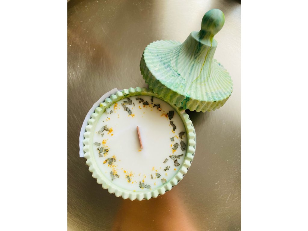Veganská sójová svíčka s vůní eukalyptu, citronové máty a citrusů, zdobená citronovou kůrou a kousky eukalyptu. Má dřevěný knot.