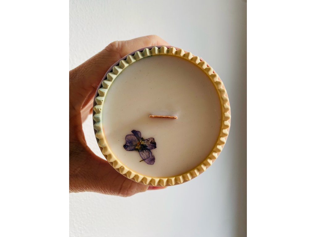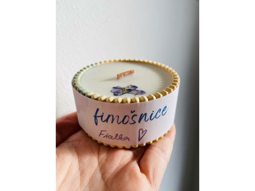 Veganská sójová svíčka s vůní fialky obsahující vylisovaný květ fialky a dřevěný knot.