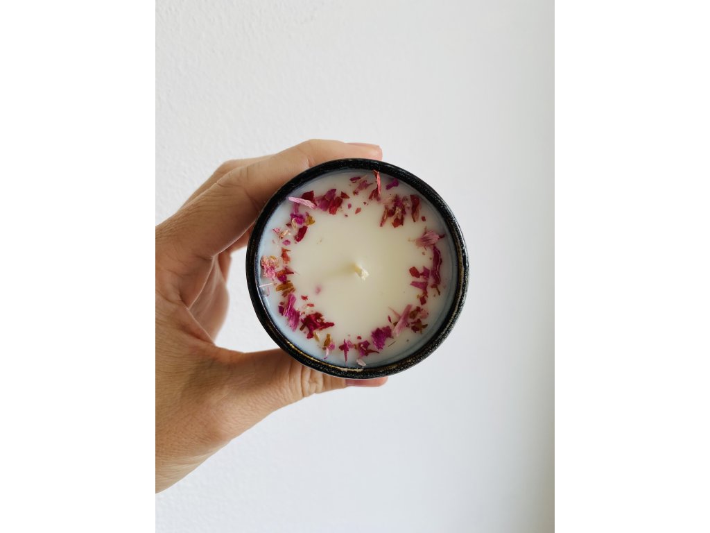 Veganská sójová svíčka s květinovými tóny obsahující sušené okvětní lístky růže/pivoňky ze zahrádky.