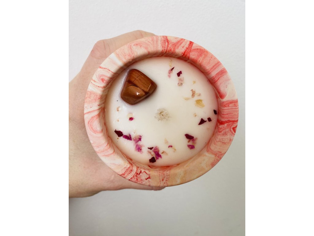 Veganská sójová svíčka s květinovými tóny obsahující sušené okvětní lístky růže ze zahrádky a jeden drahý kamínek.