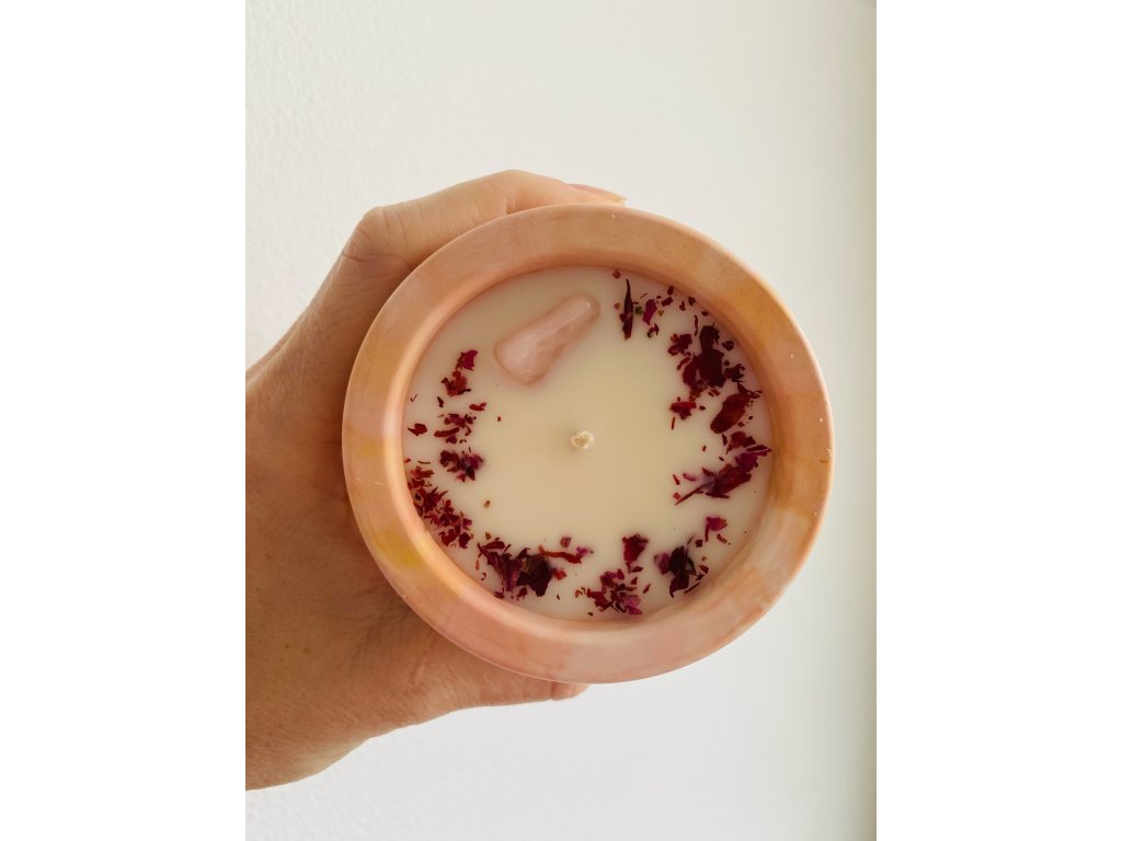 Veganská sójová svíčka s květinovými tóny obsahující sušené okvětní lístky růže ze zahrádky a jeden drahý kamínek.