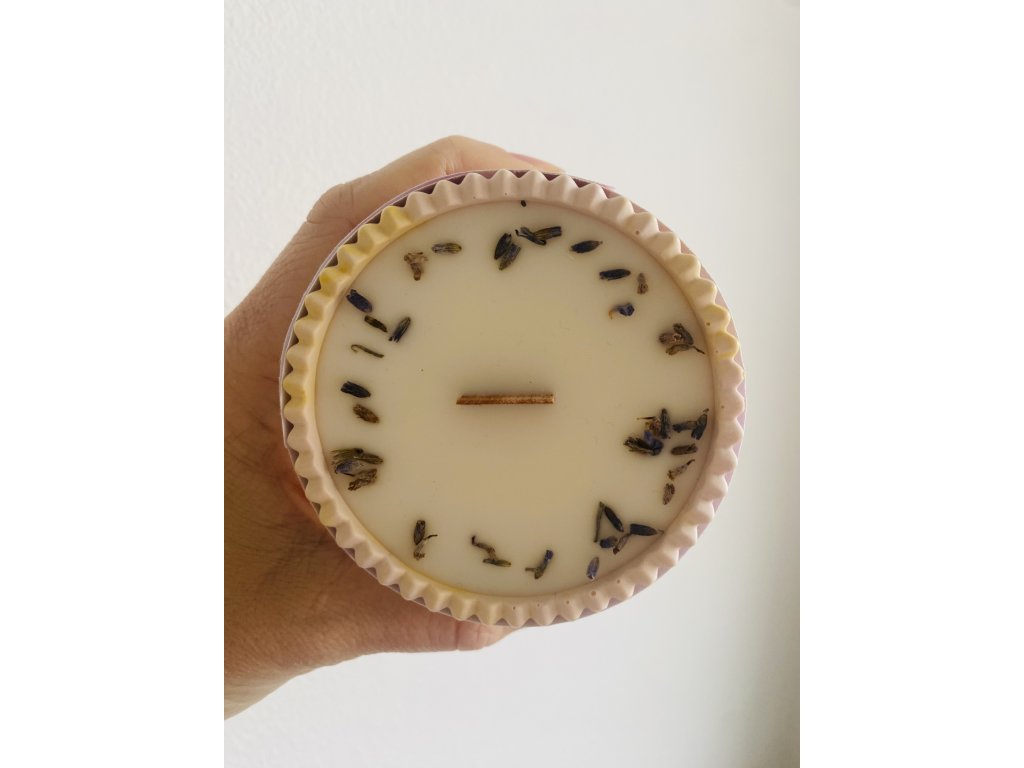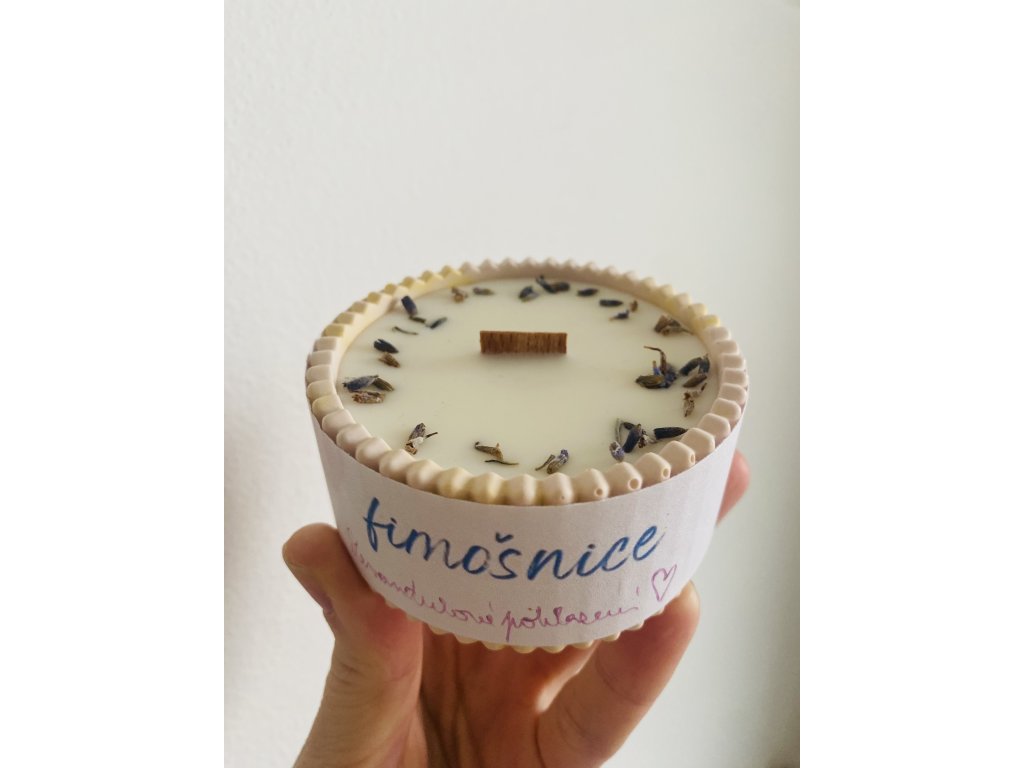 Veganská sójová svíčka s vůní levandule, obsahující sušenou bio levanduli ze zahrádky. Má dřevěný knot.