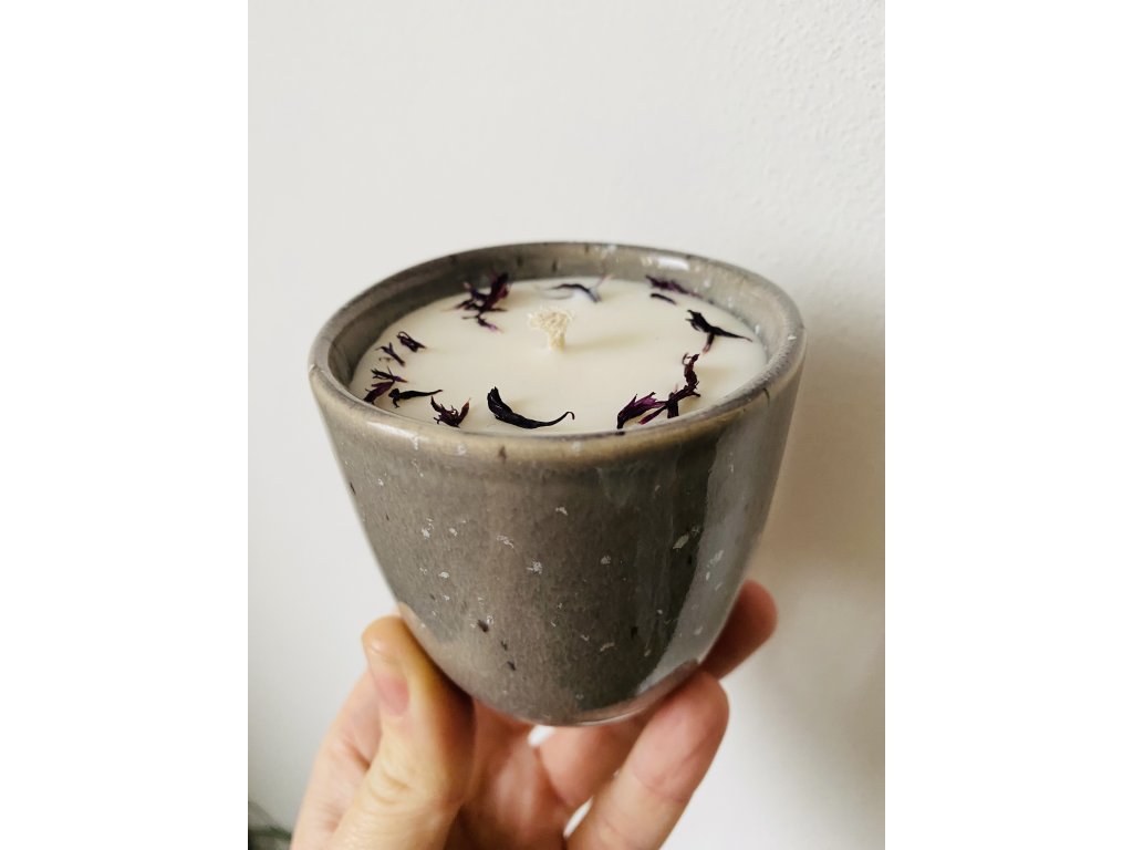 Veganská sójová svíčka s vůní jasmínu, mandarinky a santalového dřeva obsahující okvětní lístky chrpy.