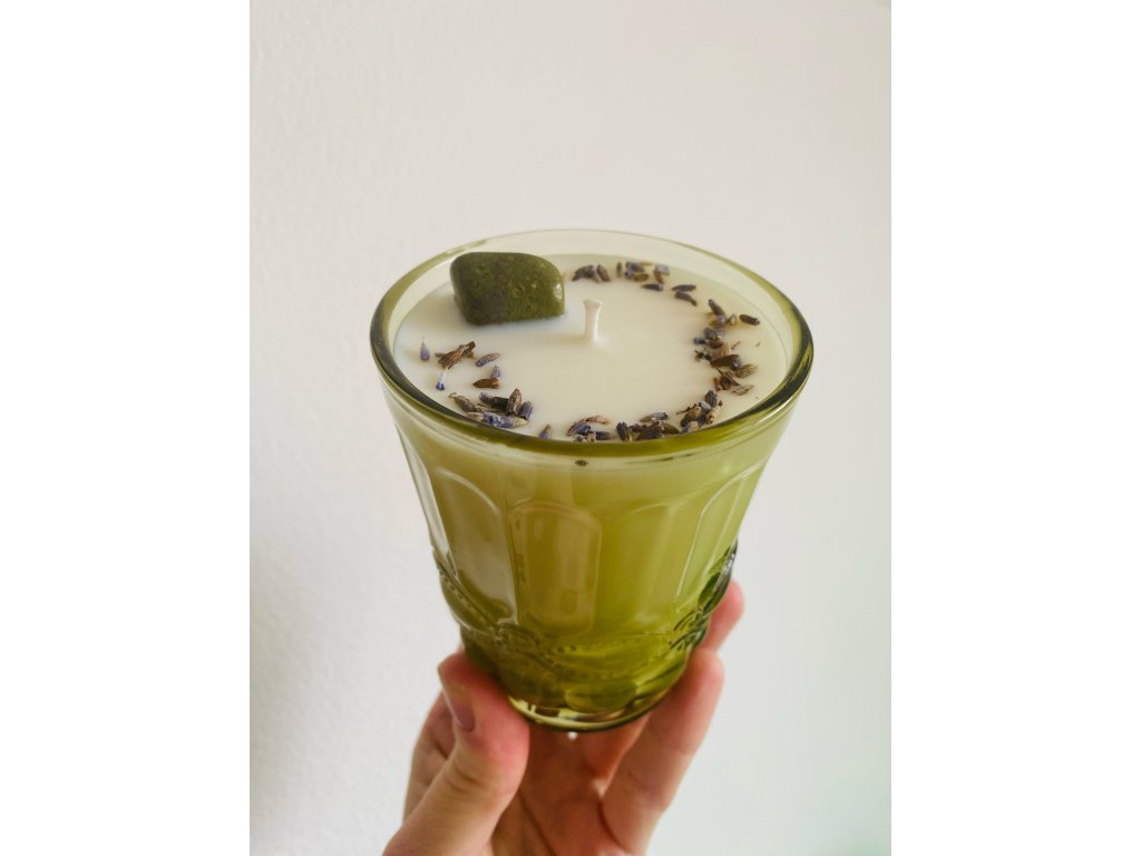 Veganská sójová svíčka s vůní levandule, obsahující sušené kvítky levandule ze zahrádky a jeden drahý kamínek.