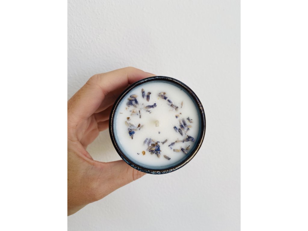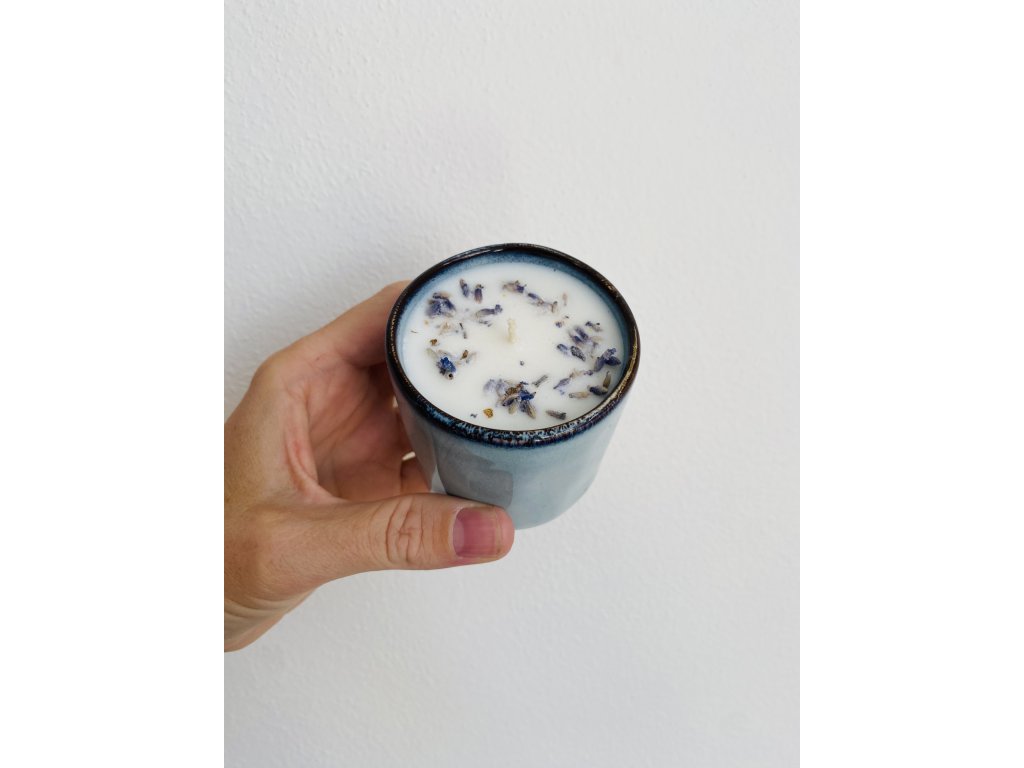 Veganská sójová svíčka s vůní levandule obsahující sušenou bio levanduli ze zahrádky.