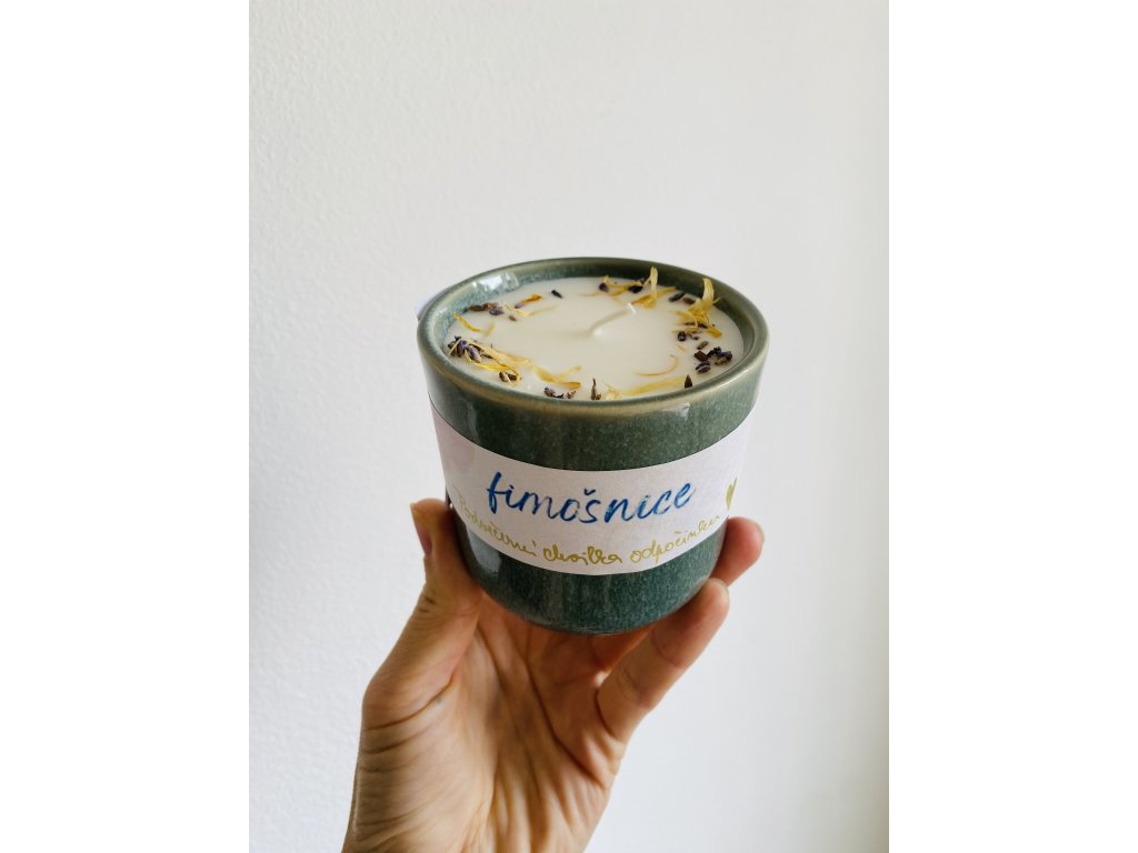 Veganská sójová svíčka s vůní levandule, meduňky a citronové trávy, obsahující sušenou bio levanduli ze zahrádky a měsíček.