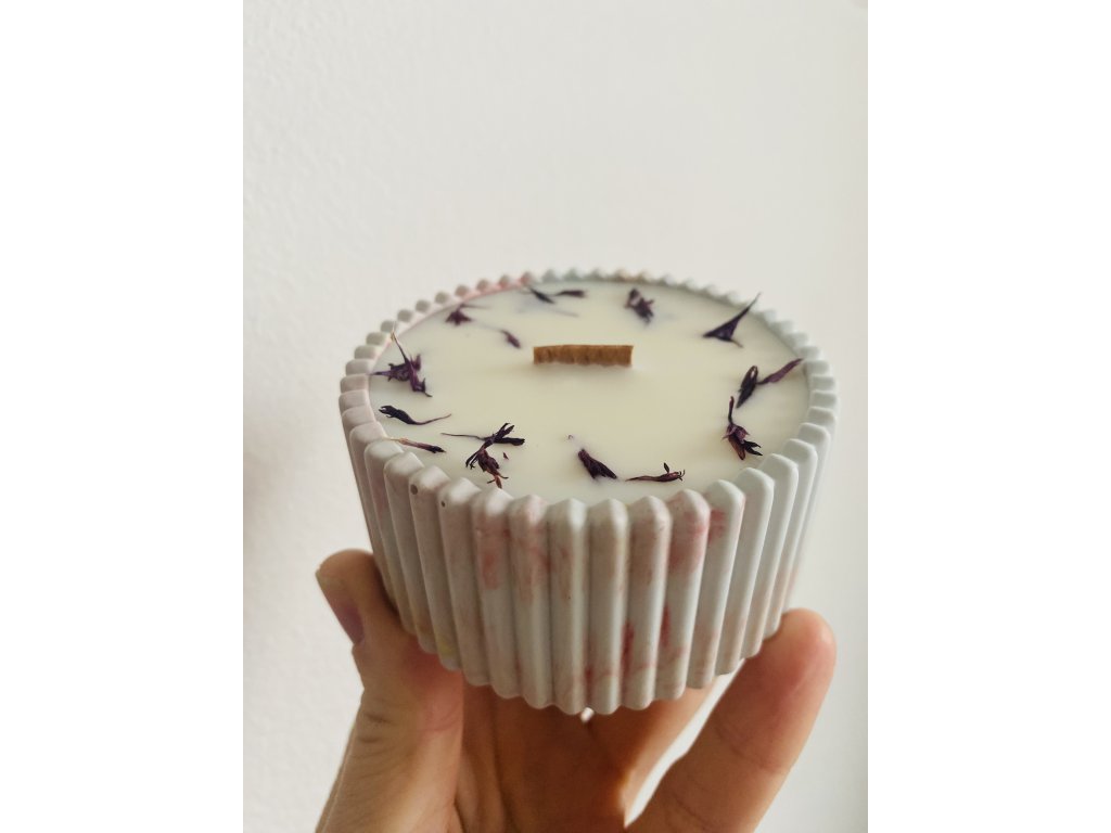 Nádoba je ručně vyrobena z lehkého betonu v mramorovém vzhledu,která se dá po vypálení svíčky dále požívat. Tento materiál je velmi odolný a nehořlavý. Díky ruční výrobě se mohou v materiálu objevit malé nedokonalosti, jako jsou například vzduchové bublinky, které nemají na celkovou kvalitu vliv a jsou běžným jevem.