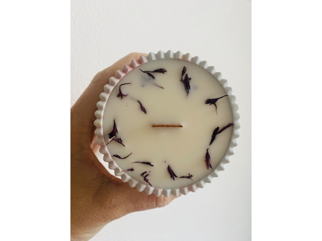Veganská sójová svíčka s vůní jasmínu, mandarinky a santalového dřeva obsahující okvětní lístky chrpy. Má dřevěný knot.