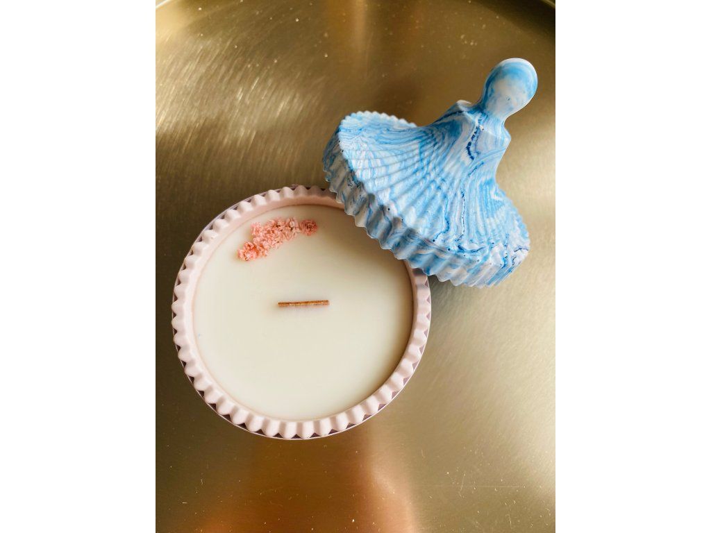 Veganská sójová svíčka s vůní santalu, pačule, pižma a pelargonie, obsahující sušené květy nevěstina závoje. Má dřevěný knot. Spodní část svíčky je růžová, vrchní je modrá.