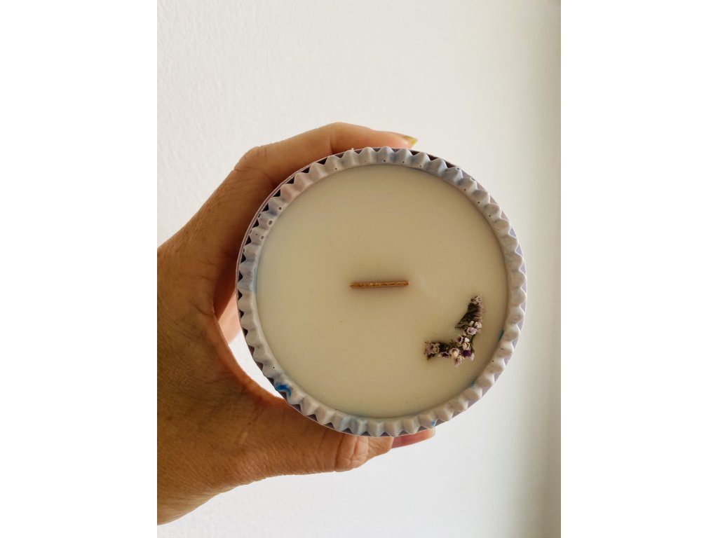 Průměr svíčky je cca 8 cm, výška je 3,5 cm. Svíčka bude hořet nejméně 12 hodin.