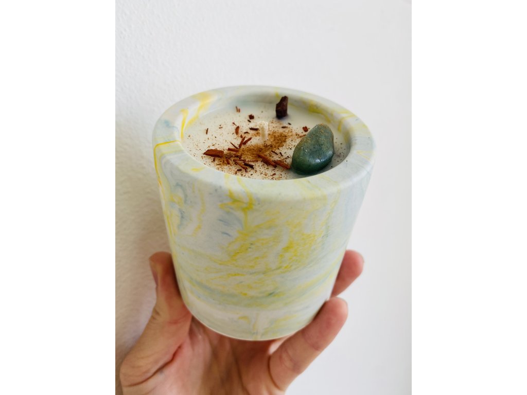 Nádoba je ručně vyrobena z lehkého betonu v mramorovém vzhledu,která se dá po vypálení svíčky dále požívat. Tento materiál je velmi odolný a nehořlavý. Díky ruční výrobě se mohou v materiálu objevit malé nedokonalosti, jako jsou například vzduchové bublinky, které nemají na celkovou kvalitu vliv a jsou běžným jevem.